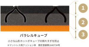 測定値を基に硬さの違うキューブウレタンを10cm間隔で配列。約13000通りの組み合わせから、あなたの体にぴったりフィットするマットレスをお作りいたします。肩や腰にかかる負担を軽減し、正しい姿勢へと導きます。